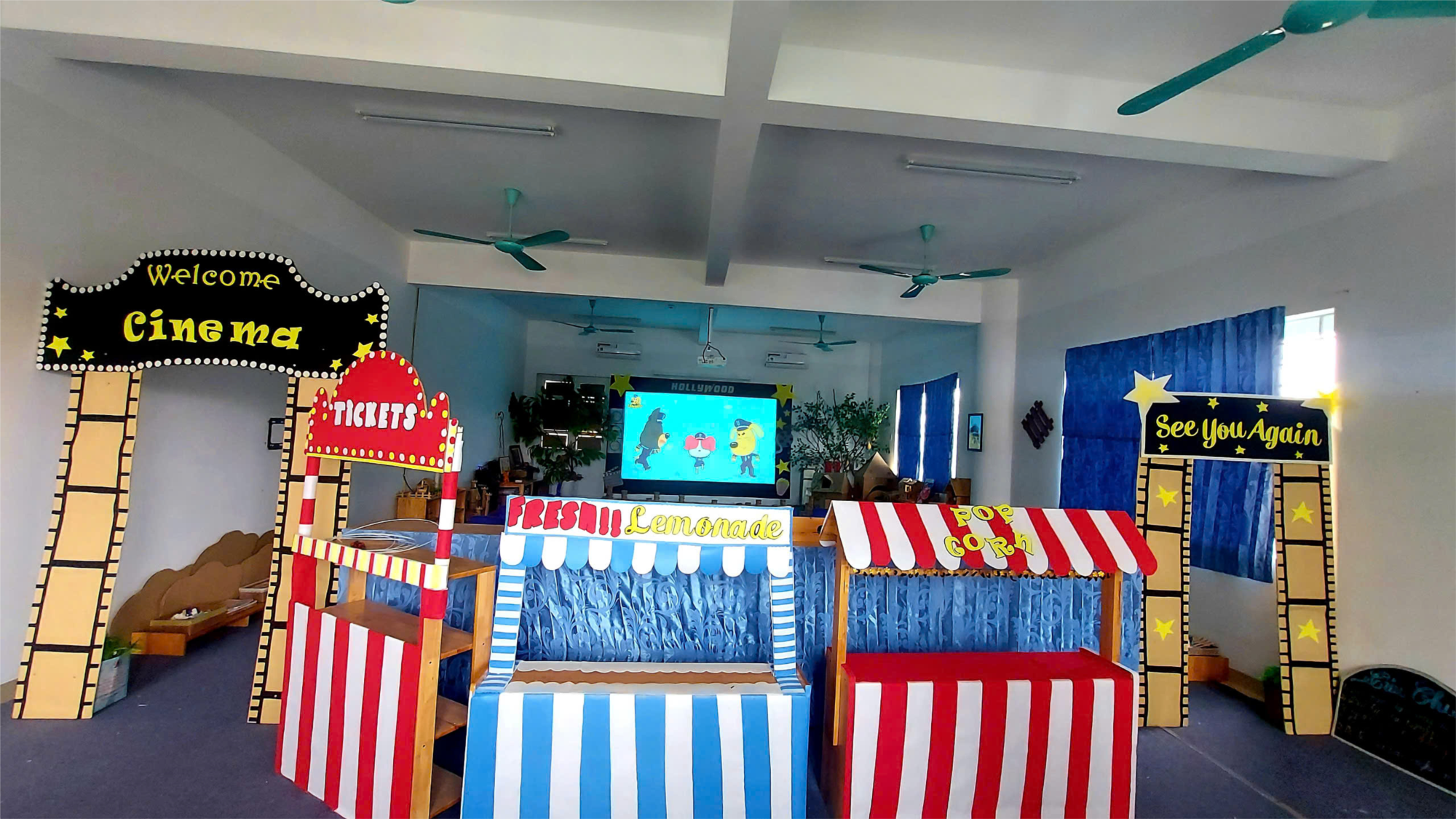 Từng chi tiết nhỏ như quầy bán vé, ghế ngồi theo số, màn hình chiếu, máy chiếu, âm thanh, ánh sáng… đều được chuẩn bị kỹ lưỡng. Đặc biệt, các bé còn được cầm trên tay những tấm vé thật, xếp hàng mua vé và nhận combo bắp rang bơ, trà chanh – đúng chuẩn một buổi xem phim thú vị!