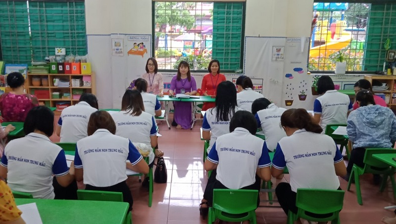 Phần thi lý thuyết được tổ chức ngay sau khi khai mạc hội thi tại phòng học lớp mẫu giáo nhỡ B2 dưới sự giám sát của 3 đồng chí trong ban giám hiệu.