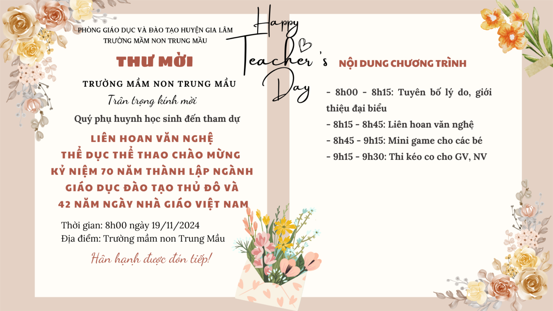Hòa trong không khí tưng bừng kỷ niệm 70 năm ngày thành lập ngành Giáo dục và Đào tạo Thủ đô (1954-2024) và 42 năm ngày Nhà giáo Việt Nam (20/11/1982 - 20/11/2024), sáng ngày 19/11/2024, trường mầm non Trung Mầu đã hân hoan tổ chức chương trình liên hoan văn nghệ, thể dục thể thao với chủ đề “Chào mừng ngày nhà giáo Việt Nam 20/11”.